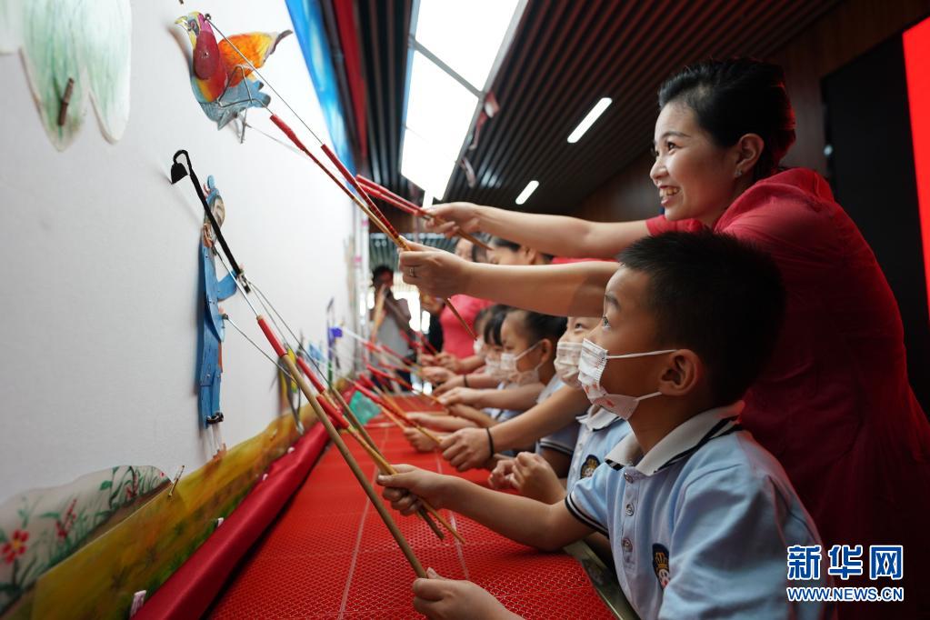 6月12日,小朋友在活动中体验沙河皮影戏表演。