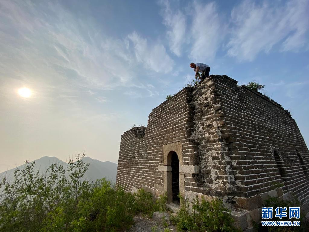 6月2日,侯云成在一座长城敌楼上清理杂草,防止对敌楼墙体产生破坏。