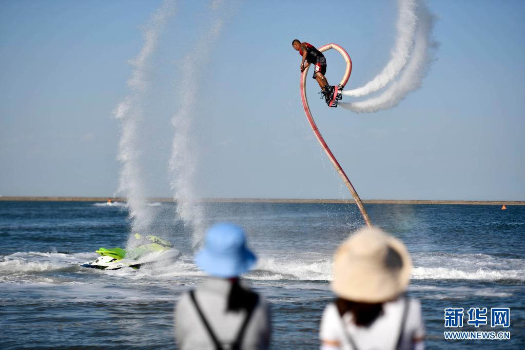 游客在天津市滨海新区东疆港人工沙滩观看水上特技表演(6月5日摄)。