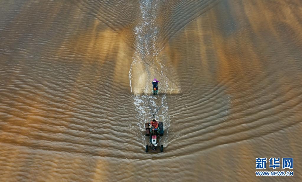 6月5日,南堡盐场的工人在盐田操作机械设备作业(无人机照片)。