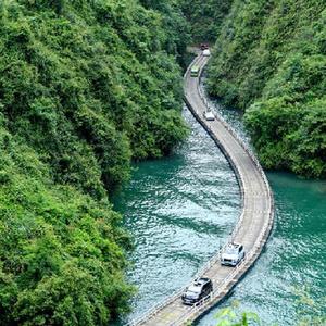 6月12日,游客驾车穿越湖北省恩施土家族苗族自治州宣恩县狮子关风景区的水上浮桥。