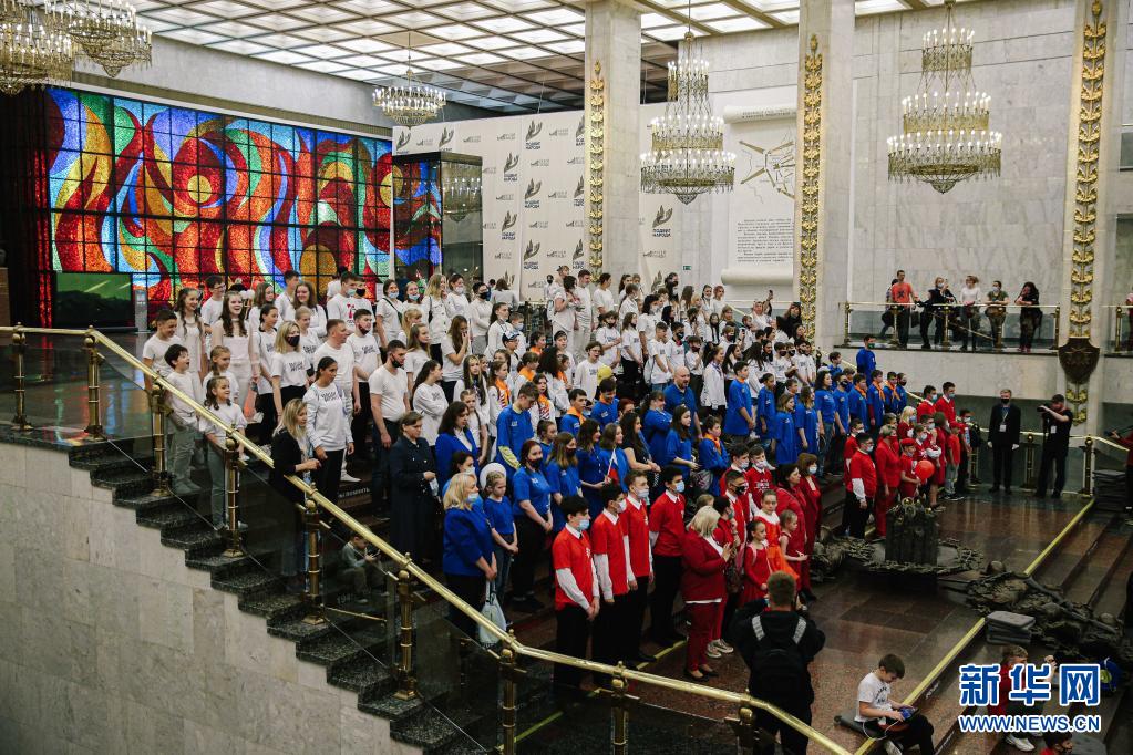 6月12日,人们在俄罗斯首都莫斯科胜利博物馆齐唱国歌,庆祝俄罗斯的国庆日“俄罗斯日”。新华社发(叶甫盖尼·西尼岑 摄)