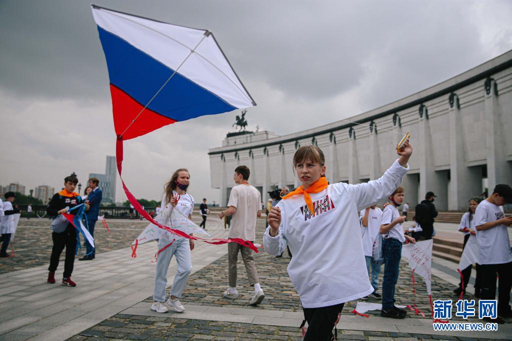 6月12日,在俄罗斯首都莫斯科,孩子们放飞风筝,庆祝俄罗斯的国庆日“俄罗斯日”。新华社发(叶甫盖尼·西尼岑 摄)