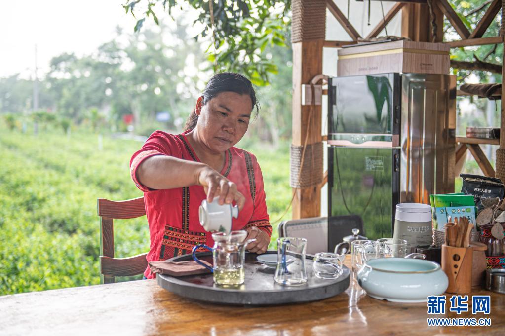 6月10日,符小芳在海南白沙黎族自治县五里路茶园冲泡茶园生产的茶品。