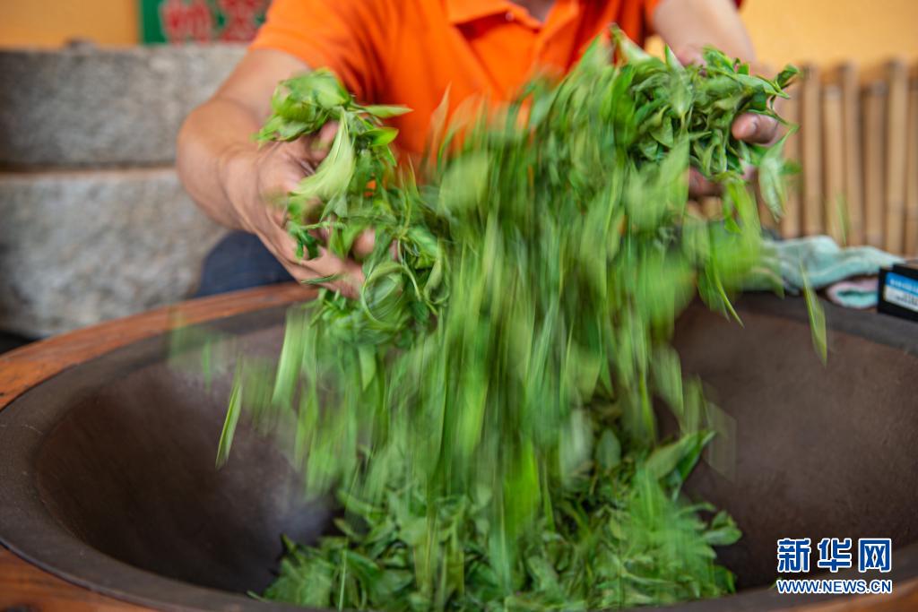 6月9日,工作人员在海南白沙黎族自治县五里路茶园演示手工炒茶。