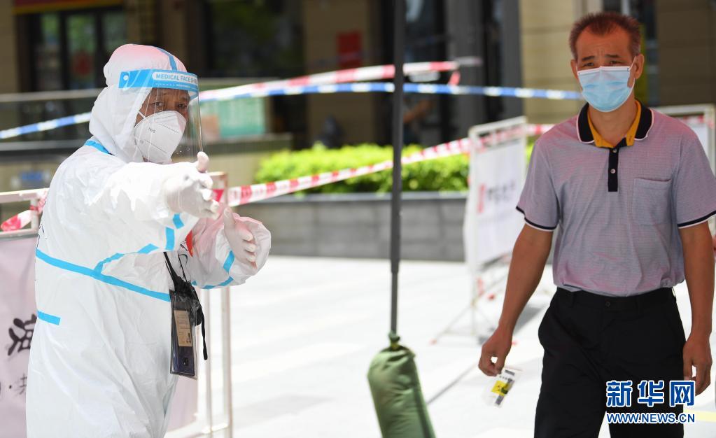 6月12日,在广州荔湾区白鹤洞街广钢新城,防疫志愿者指引居民前往核酸检测。