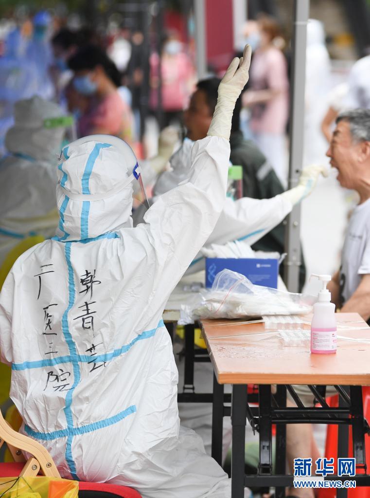 6月12日,在广州荔湾区白鹤洞街广钢新城,医务人员举手示意居民前来进行核酸检测采样。