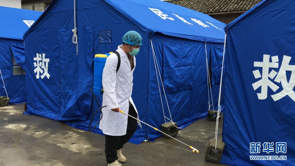 6月13日,在盈江县卡场镇卡场村委会咱巴石村村民小组地震救灾安置点,工作人员进行防疫消杀。