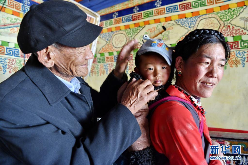 米玛老人(左)与家人在一起(4月18日摄)。新华社记者 张汝锋 摄