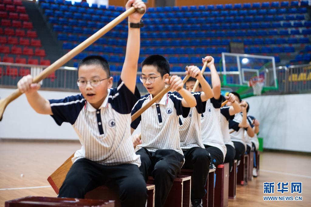 在正则学校体育馆,学生们正在练习划龙舟(6月10日摄)。