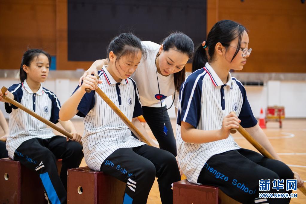 在正则学校体育馆,体育老师任瑶(右二)在龙舟课上辅导学生(6月10日摄)。