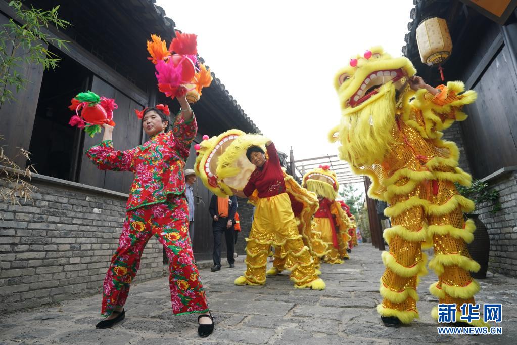 6月13日,在盱眙县第一山历史文化街区,民俗演员在舞狮。