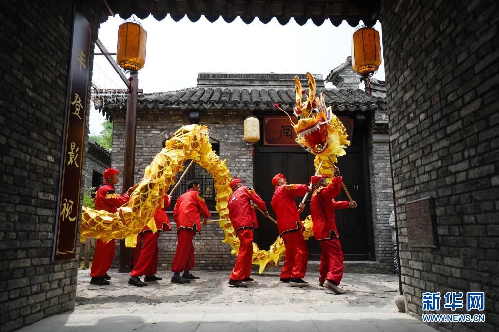 6月13日,在盱眙县第一山历史文化街区,民俗演员在舞龙。