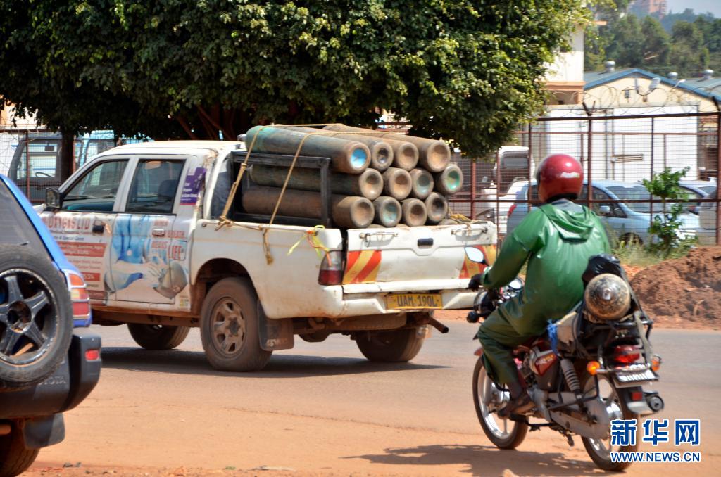 6月13日,一辆汽车在乌干达坎帕拉运输氧气罐。