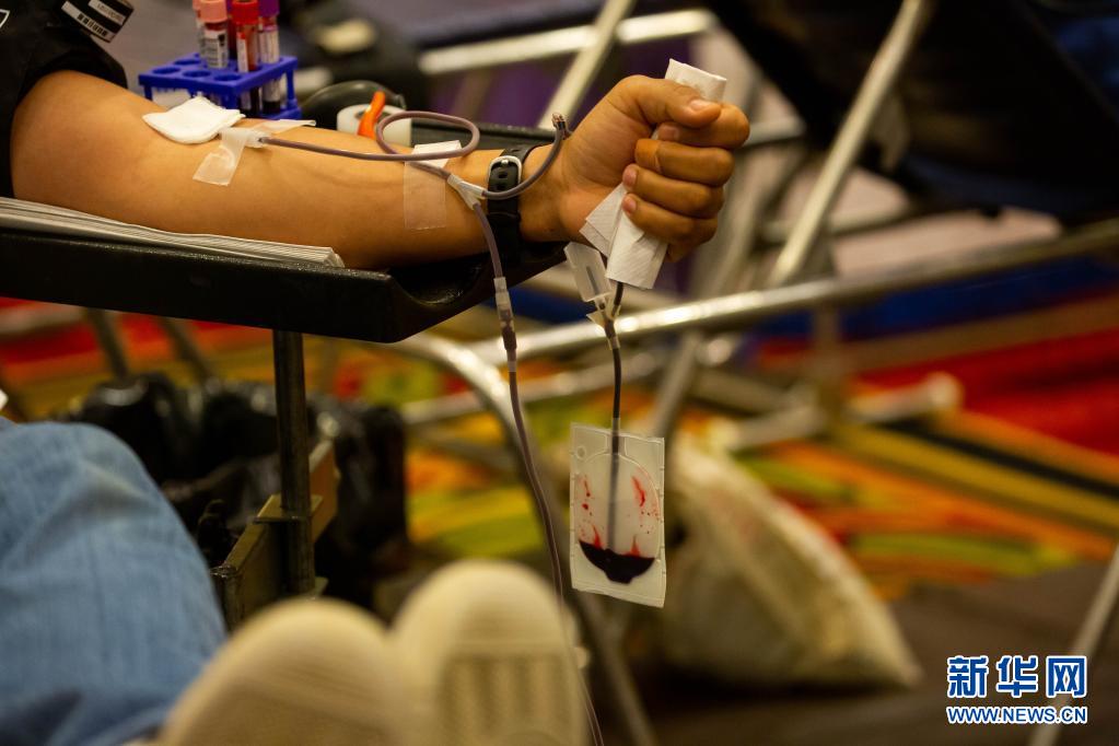 6月14日,在美国纽约州长岛地区的尤宁代尔,献血志愿者在美国纽约血液中心举行的献血活动上献血。
