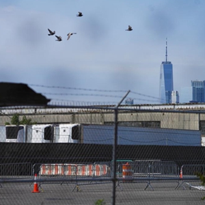 6月14日,在美国纽约布鲁克林,存放尸体的冷藏车停放在一处临时停尸场内。