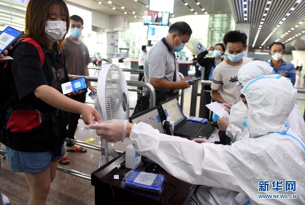6月16日,旅客在广州南站通过刷身份证识别健康码状态。