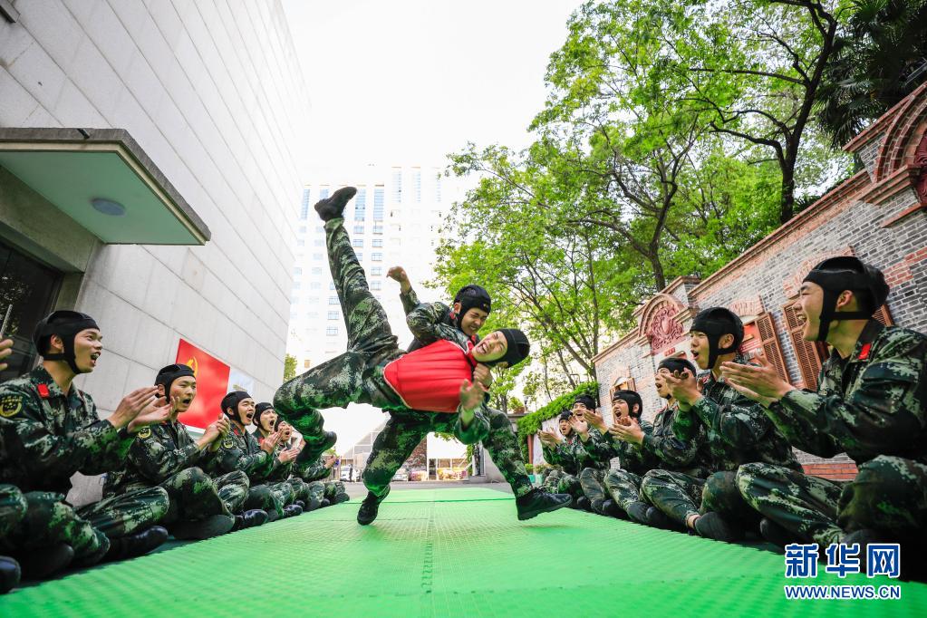 武警上海总队执勤第四支队执勤十中队官兵在营区内开展摔擒训练(2021年4月20日摄)。