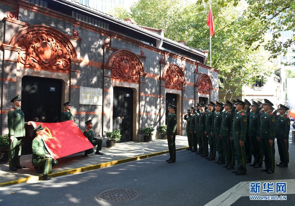 武警上海总队执勤第四支队执勤十中队官兵在中共一大纪念馆前重温入党誓词(2017年11月1日摄)。