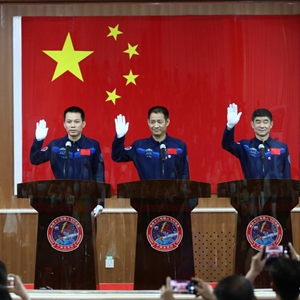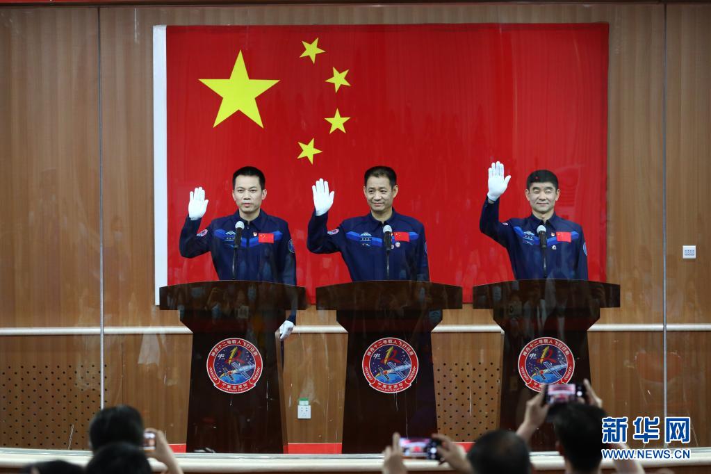 6月16日,神舟十二号载人飞行任务航天员聂海胜(中)、刘伯明(右)和汤洪波在酒泉卫星发射中心与记者见面。
