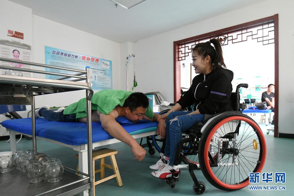在山西省吕梁市石楼县中医医院,关美(右)陪着周海云进行康复训练(6月2日摄)。新华社发(刘亮亮摄)