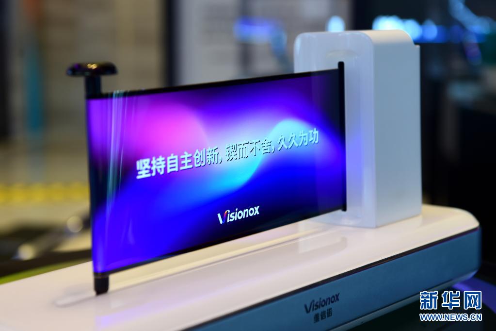 这是维信诺科技股份有限公司展出的可像纸张一样弯曲折叠的柔性显示屏(6月17日摄)。