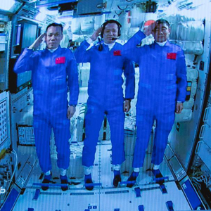 6月17日在北京航天飞行控制中心拍摄的进驻天和核心舱的航天员向全国人民敬礼致意的画面。