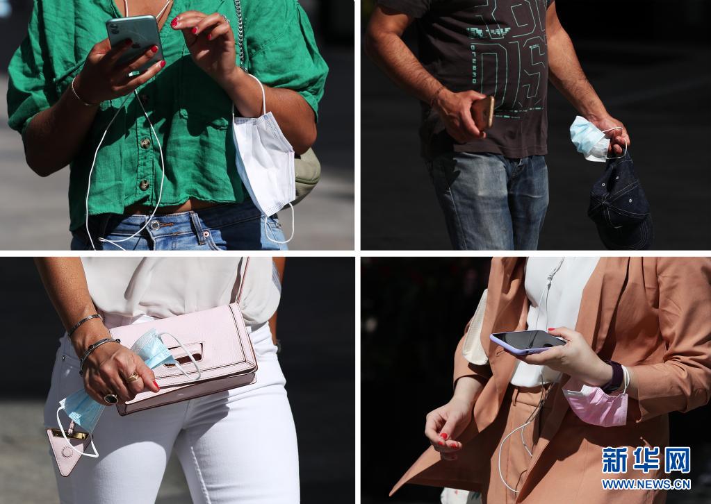 这张拼版照片显示,6月17日,人们拿着口罩走在法国巴黎香榭丽舍大街上。
