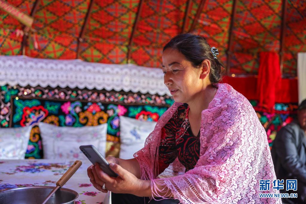 在新疆裕民县巴尔鲁克山区夏牧场上,一名开办牧家乐的牧民在毡房内用手机上网(6月16日摄)。