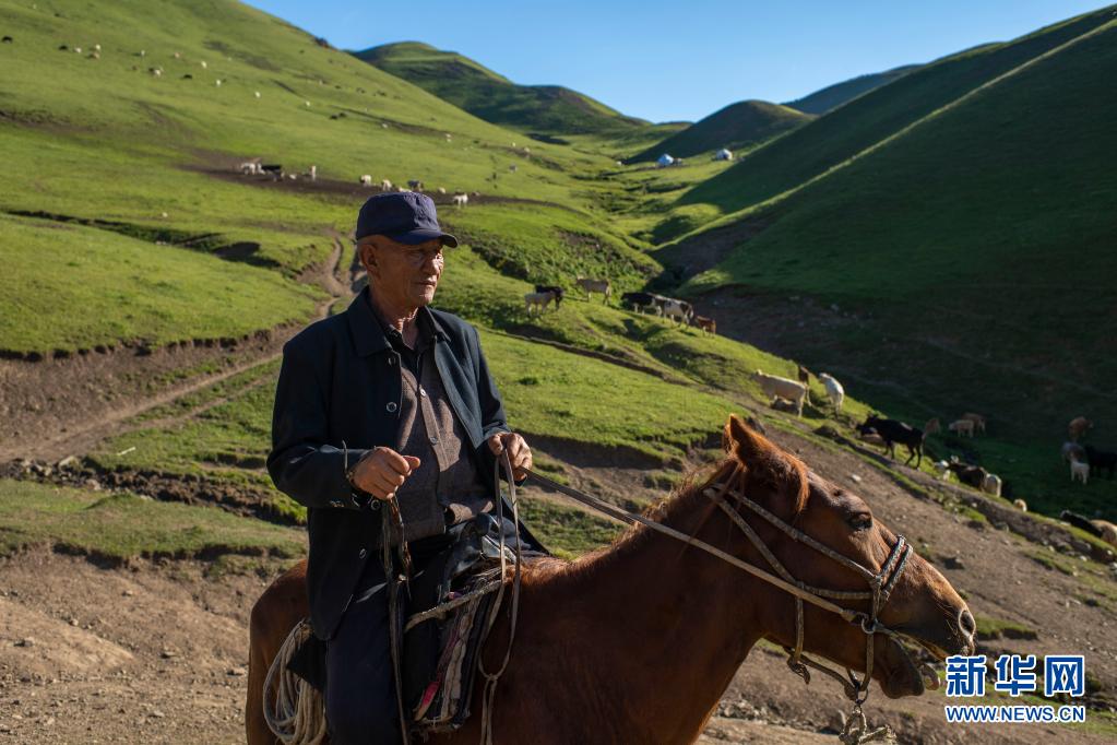 新疆裕民县的牧民在巴尔鲁克山区夏牧场上放牧(6月15日摄)。
