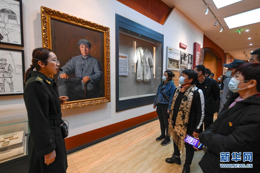 宁夏盐池县革命烈士纪念园讲解员(左一)为前来参观的游客介绍毛泽民在盐池县的故事(4月15日摄)。新华社记者 冯开华 摄