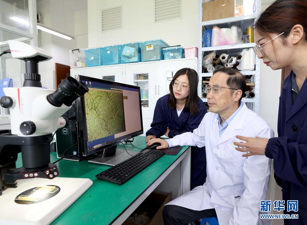 东华大学副校长、材料专家陈南梁教授(右二)与其博士、硕士研究生在东华大学纺织科创中心实验室分析大型可展开星载天线金属网反射面材料的细观结构。(5月21日摄)。中国纺织服装高等院校为纺织工业快速发展提供了大量的人才。