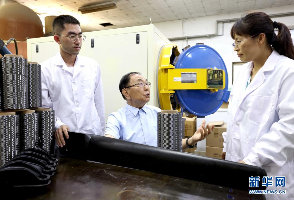 中国工程院院士、力学和复合材料专家杜善义教授(中)和北航李敏教授(右)等在北京航天航空大学聚合物基复合材料实验室就碳纤维有关问题进行交流(6月10日摄)。