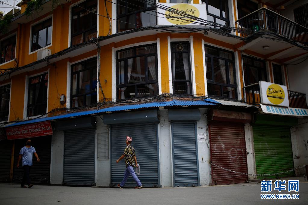 6月17日,人们经过尼泊尔加德满都旅游集散地泰米尔内关闭的商铺。
