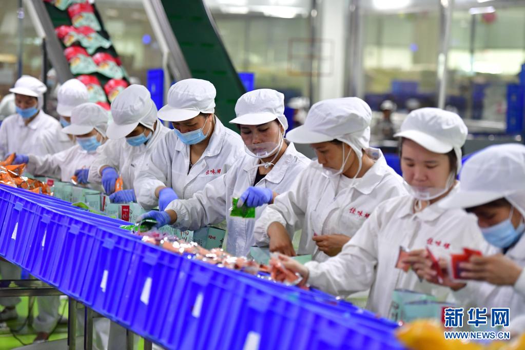 6月17日,工人在广西善元食品有限公司螺蛳粉生产车间包装螺蛳粉。