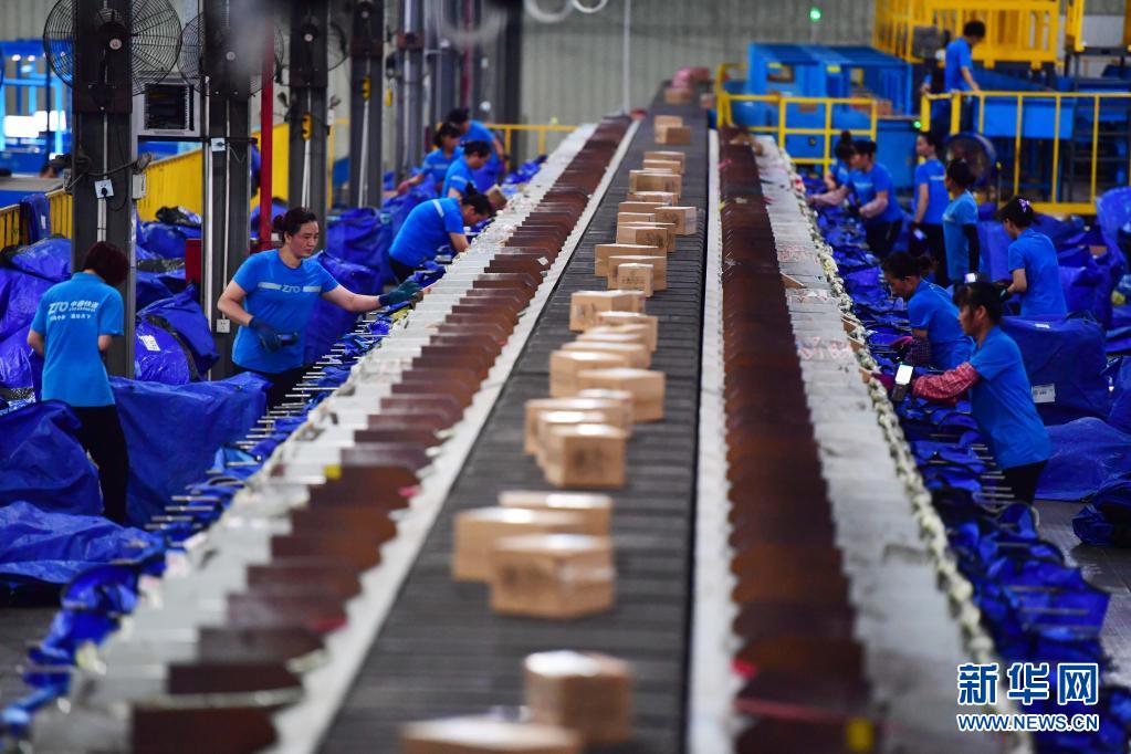 6月17日,在中通快递广西柳州转运中心,员工对螺蛳粉快件进行分拣。新华社记者 黄孝邦 摄