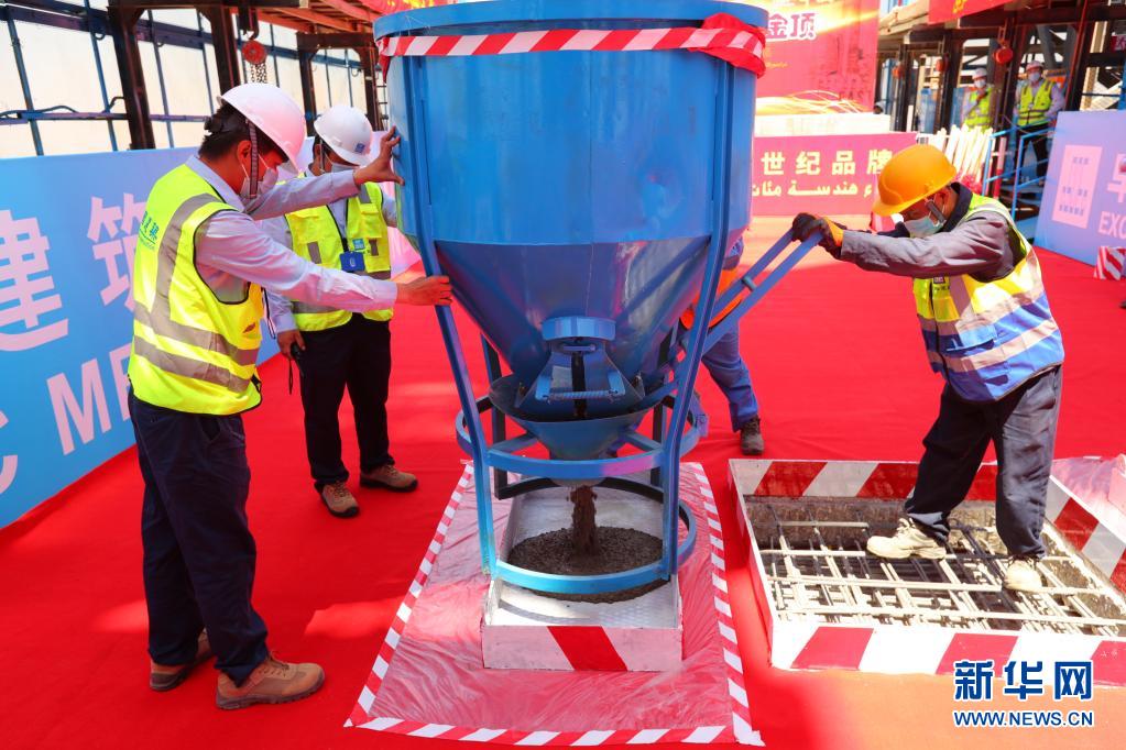 6月17日,工人在埃及开罗附近的埃及新行政首都中央商务区标志塔准备用于该塔封顶的混凝土。新华社记者 隋先凯 摄
