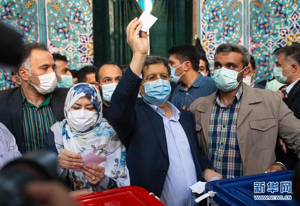 6月18日,总统候选人央行前行长阿卜杜勒纳赛尔·赫马提(中)在伊朗德黑兰一个投票点投票。新华社发(艾哈迈德·哈拉比萨斯摄)
