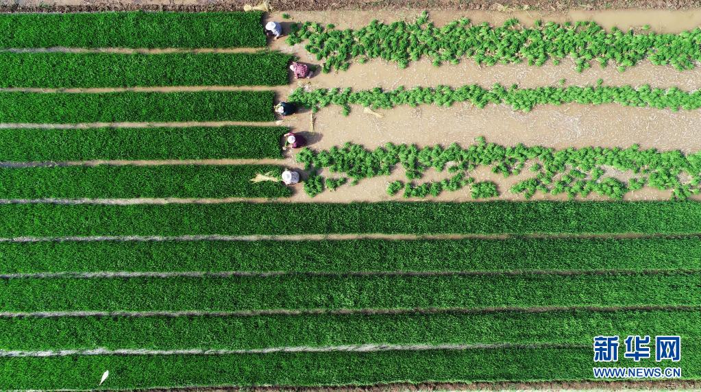 6月18日,山东省临沂市郯城县郯城街道农民整理水稻秧苗准备插秧(无人机照片)。