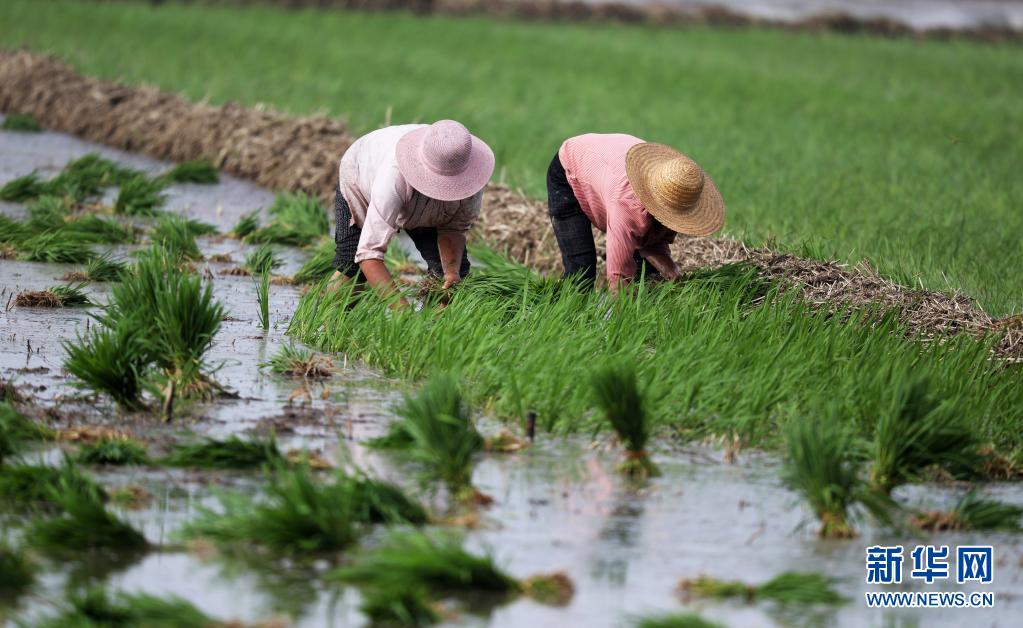 6月18日,山东省临沂市郯城县郯城街道农民进行水稻插秧。