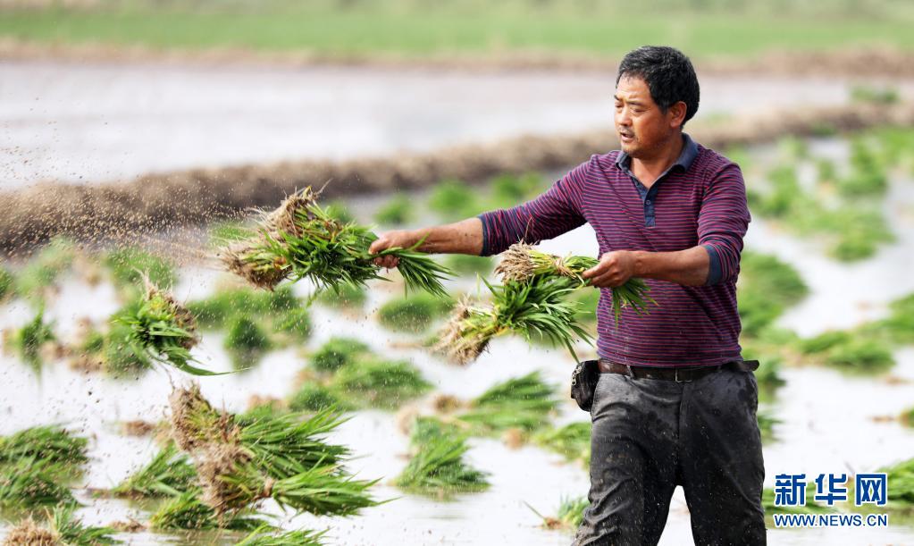 6月18日,山东省临沂市郯城县郯城街道农民准备进行水稻插秧。