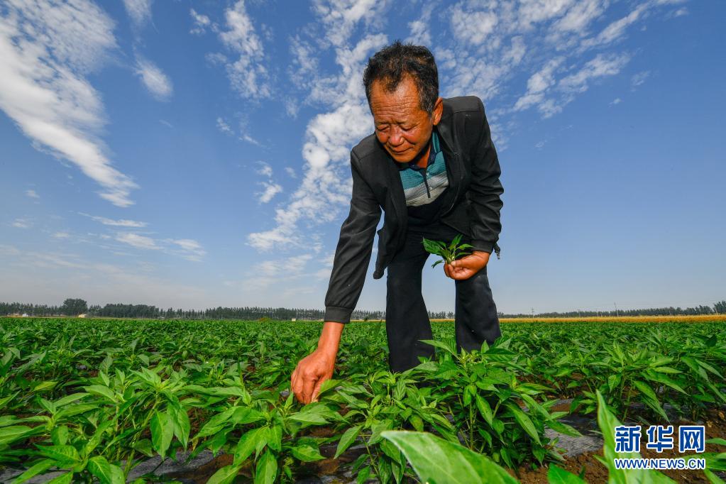在天津市宝坻区王卜庄镇李清庄村,马步云在田间给辣椒苗掐尖(6月17日摄)。