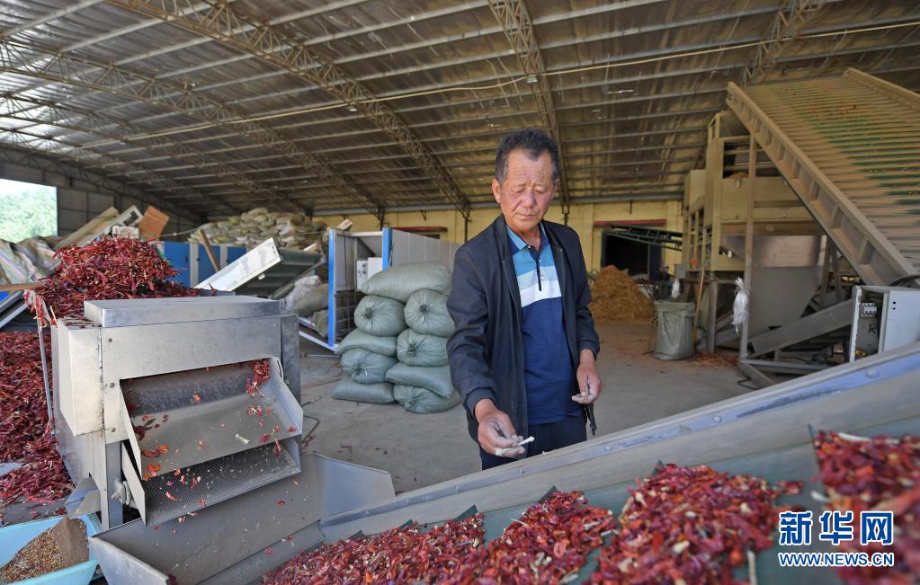 在天津三鹰农副产品加工有限公司,马步云查看准备出口的辣椒(6月17日摄)。新华社记者赵子硕摄