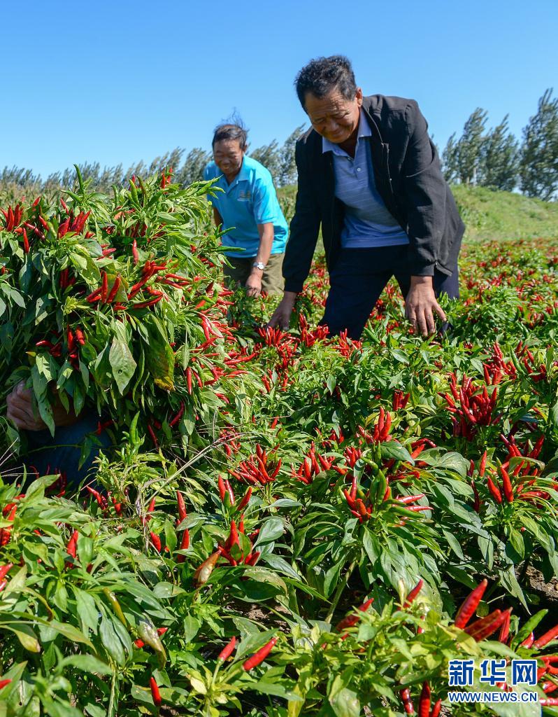 在新疆民丰县,马步云(右)实地查看当地辣椒种植情况(2020年9月17日摄)。新华社发(天津市宝坻区委宣传部供图)