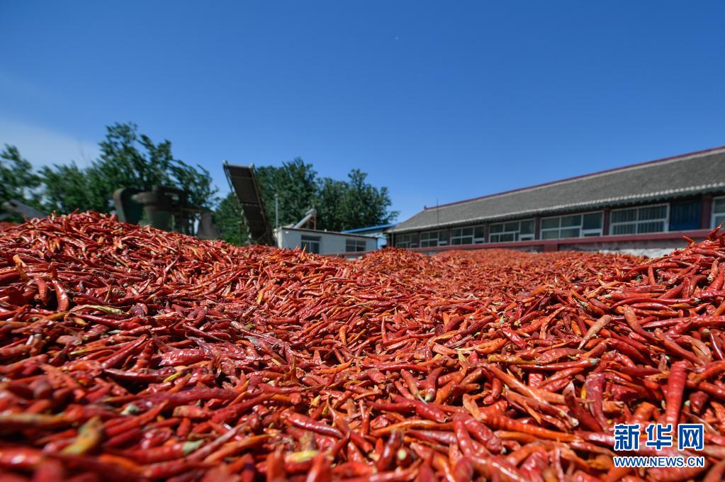 在天津市宝坻区王卜庄镇天津三鹰农副产品加工有限公司,辣椒堆放在空地晾晒(5月8日摄)。新华社发(孙凡越摄)