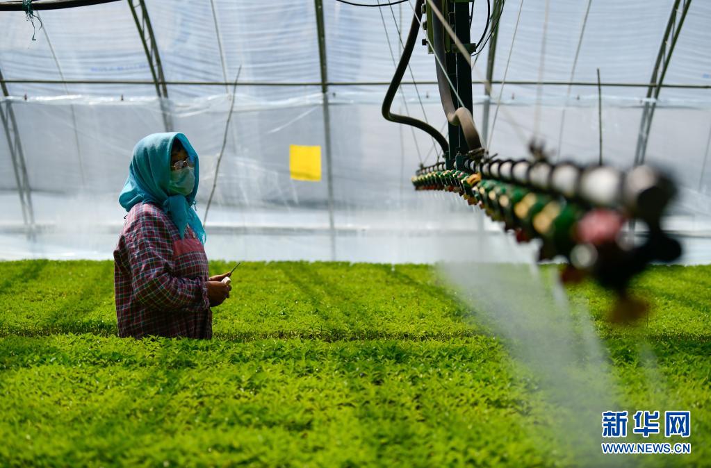 在天津市宝坻区林亭口镇育苗基地大棚,工作人员控制设备为辣椒苗浇水(5月8日摄)。新华社发(孙凡越摄)