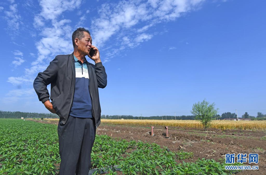 在天津市宝坻区王卜庄镇李清庄村,马步云在田间接听电话(6月17日摄)。新华社记者赵子硕摄