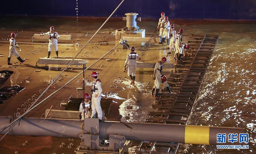 6月19日凌晨,中交一航局施工人员在沉管运输安装一体船搭载的E10管节上作业。