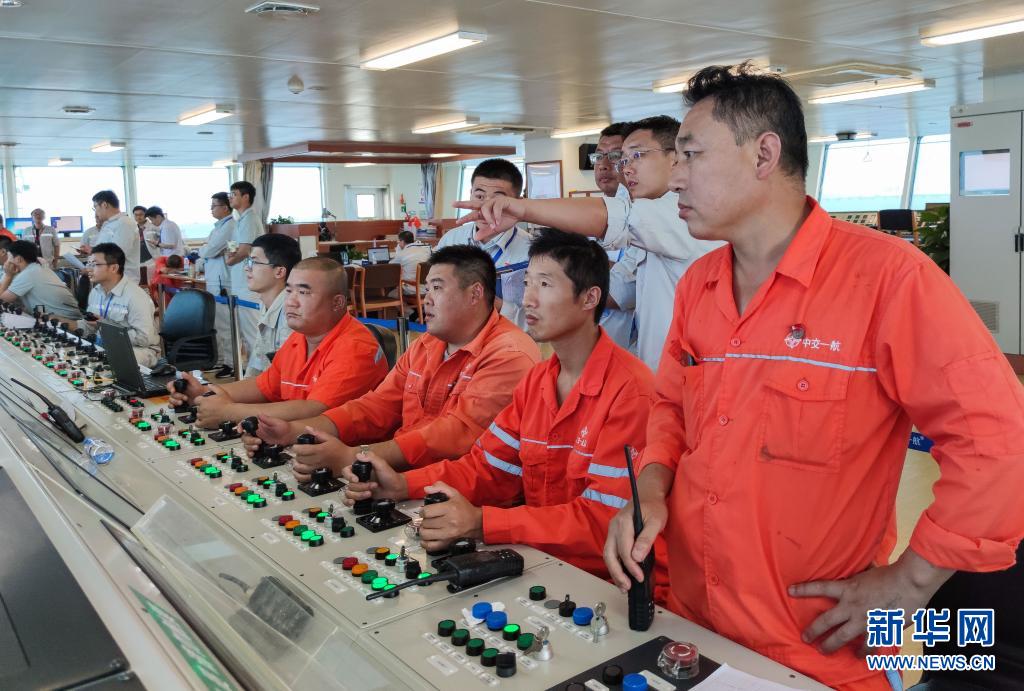 6月19日,中交一航局施工人员在搭载E10管节的沉管运输安装一体船上作业。