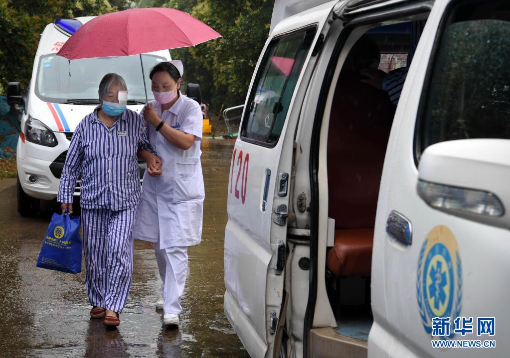 在郑州车辆段洛阳运用车间,护士搀扶手术后的患者乘车转运回洛阳市第三人民医院(6月16日摄)。